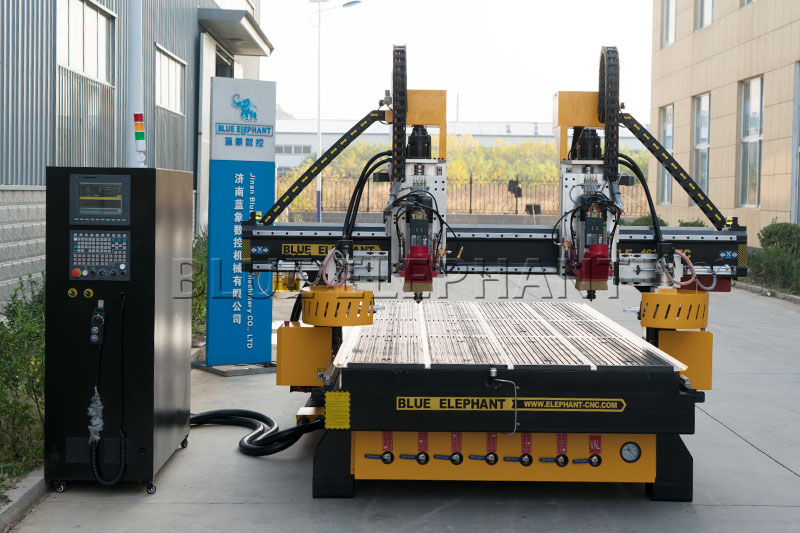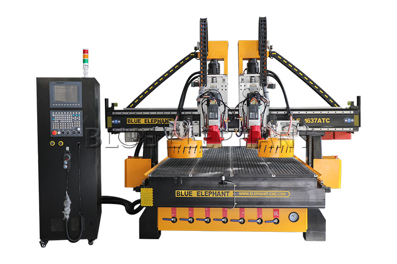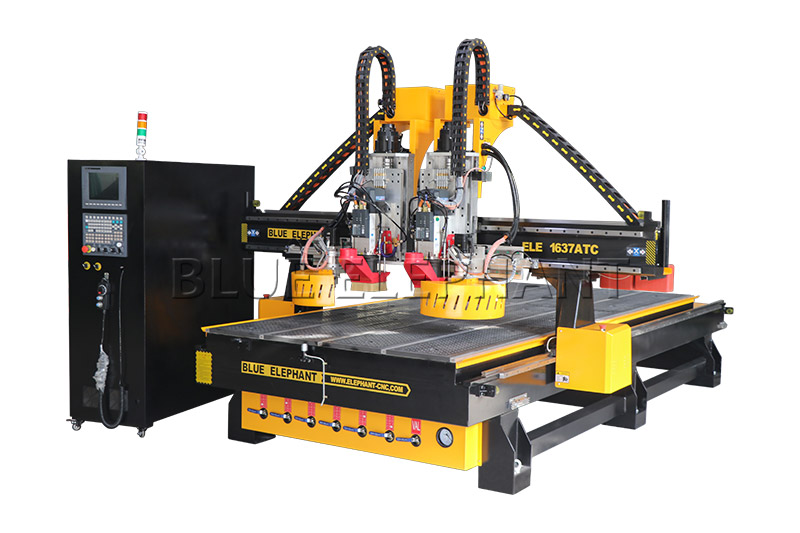 獨立雙頭圓盤自動換刀雕刻機,2個圓盤8刀庫,刀庫位于主軸旁,加工中可同時換刀,節省換刀時間,提高了工作效率。